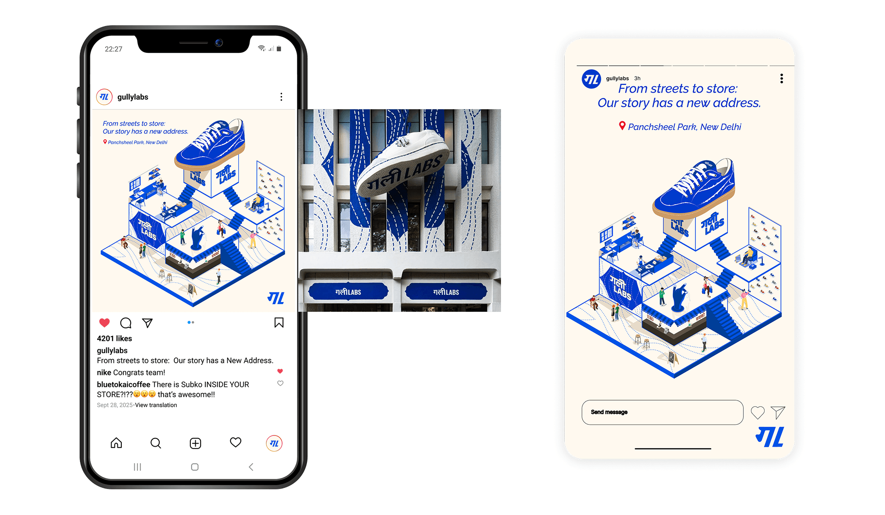 Gully Labs – Flagship Store Launch KV is a campaign-led visual project created for the launch of the brand’s Delhi flagship store. The project translates the physical retail space into a dynamic isometric key visual, using layered storytelling to highlight different brand experiences. Designed to be adaptable across digital and print formats, the KV blends Indian craftsmanship with contemporary street culture, creating a bold, narrative-driven brand moment.
